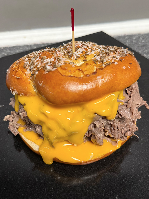 Roast Beef dipped in Au Jus served with Cheddar Cheese Sauce on Kimmelweck Pretzel Roll and a side of Au Jus for dipping.