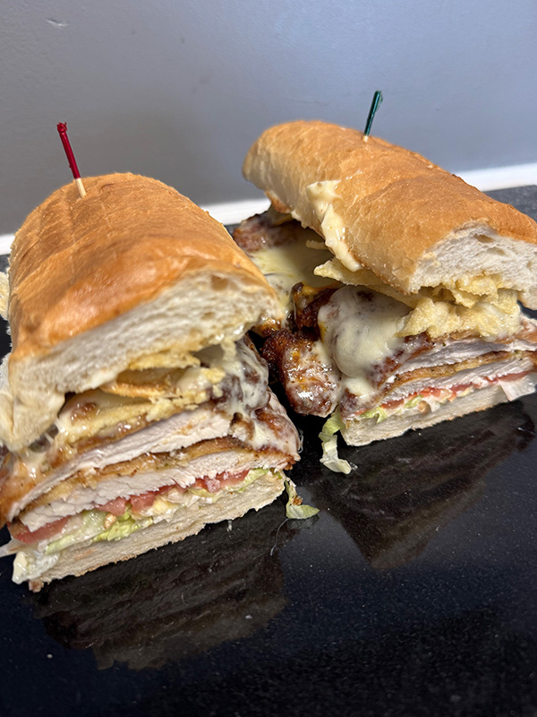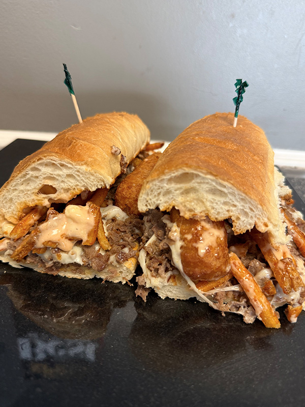 Chopped Steak with a Hot Buffalo Bleu Cheese, Mozzarella Sticks, Seasoned French Fries, and Melted Mozzarella all served on a Toasted Sub Roll.