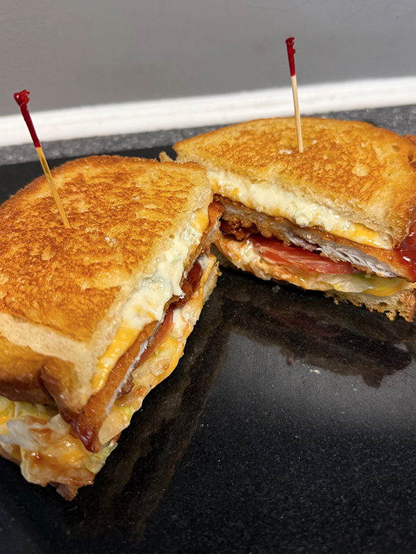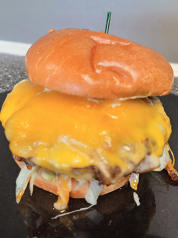 1/2LB Burger with a Bacon Onion Jam, Pickle Mayo, Lettuce, Tomato, Melted Cheddar and Pepper Jack all served on a Toasted Brioche Bun.