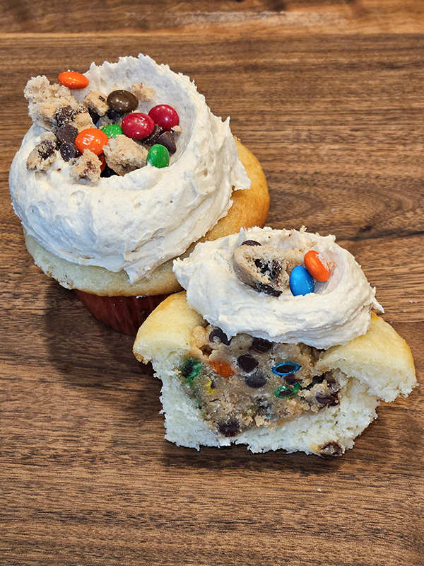 Vanilla cupcake baked with an oatmeal peanut butter monster cookie dough, and topped with peanut butter frosting, M&M’s, chocolate chips, and crushed chocolate chip cookies.