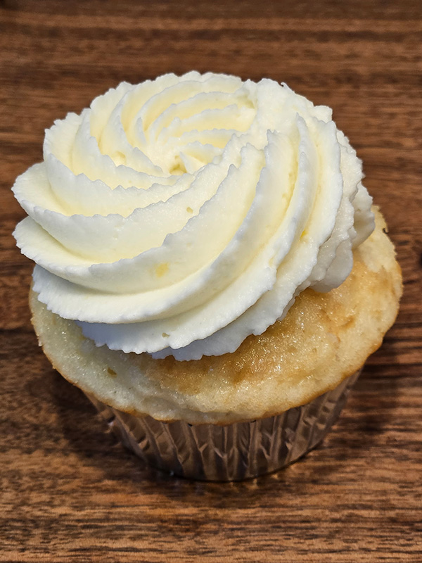 Vanilla Lemon cupcakes filled with lemon cream and topped with a lemon zest whipped cream.