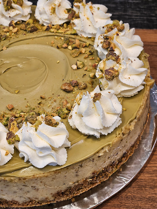 Pistachio and graham cracker crust baked with pistachio cheesecake, and topped with pistachio cream, whipped cream, and crushed pistachios.