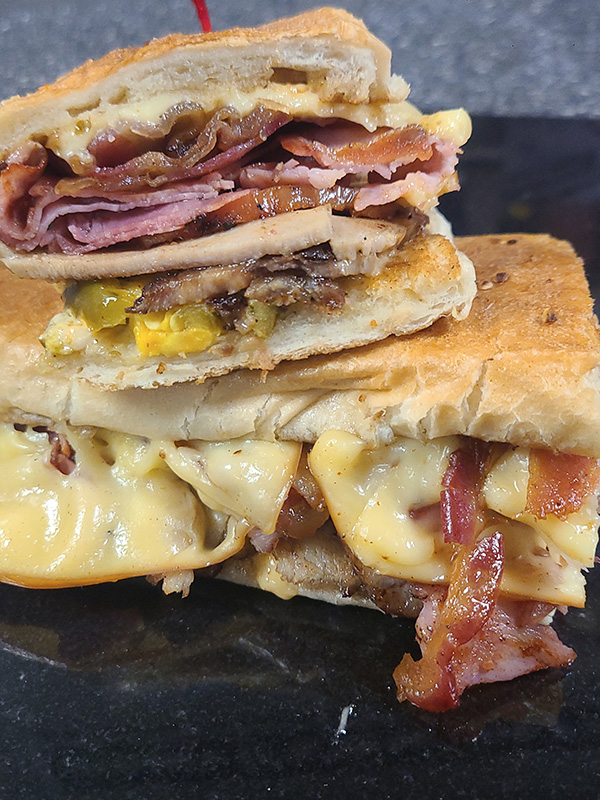 Roasted Pork Loin with Bacon, Ham, Cherry Peppers, Sriracha Mayo, and Melted Smoked Gouda all served on a Grilled Garlic Sub Roll.