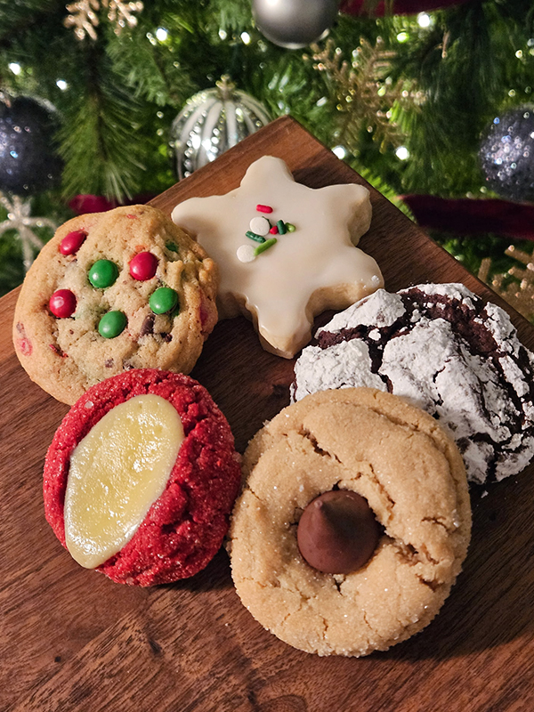 M&M, Peanut Butter Blossoms, Chocolate Crinkles, Frosted Sugar Cookies, and Red Velvet Thumbprints.