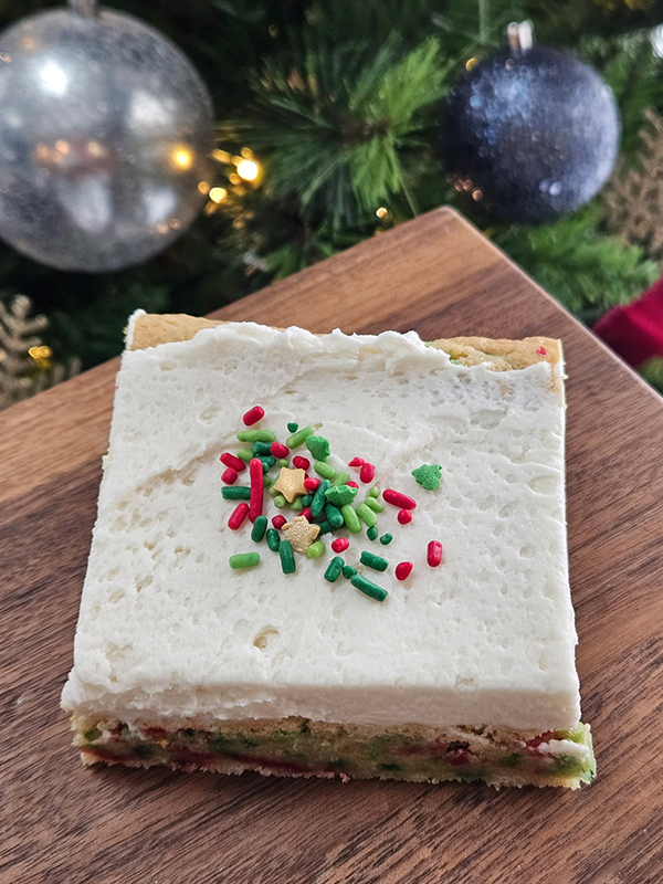 Vanilla Sugar Cookie Bars topped with whipped vanilla frosting and holiday sprinkles.