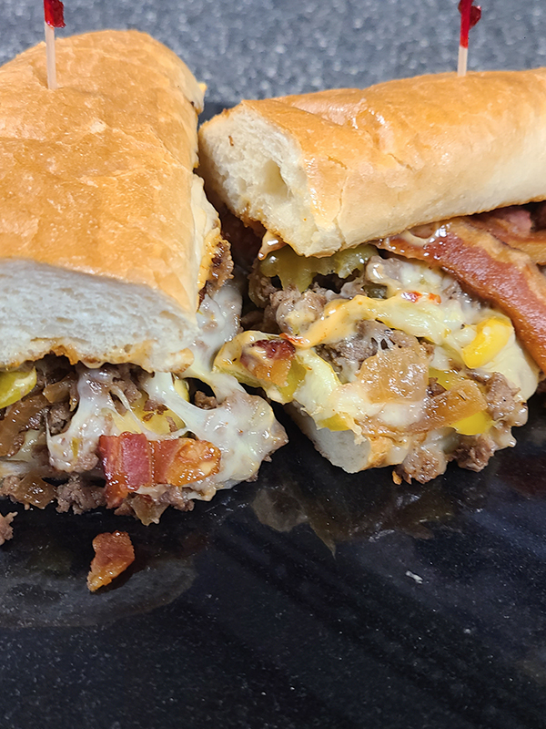 Chopped Steak with Bacon, Cajun Mayo, Honey Stinging Garlic, Pickle Slices, Sautéed Onions, Sautéed Banana Peppers, and Melted Pepper Jack all served on a Toasted Sub Roll.